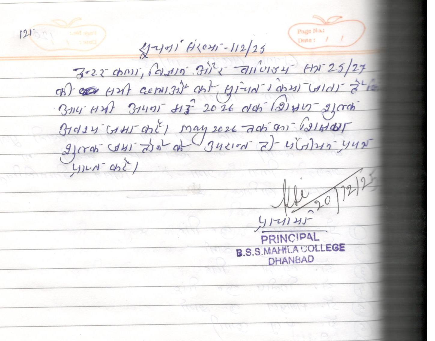 🔹 Notice no-112/2025 Date 20.12.2025 23-Dec-2025 🔹 Notice no-111/2025 Date 18.12.2025 23-Dec-2025 🔹 Notice no-109/2025 Date 08.12.2025 23-Dec-2025 🔹 Notice on Date 16.12.2025 Programme for Practical UG SEM - II ( 2019 - 2022, 2020 - 23 , 2021 - 24 ).16-Dec-2025 🔹 Notice Date on 16.12.2025 Convocation Registration Fee.16-Dec-2025 🔹 NOTICE DATE ON 02/12/2025 FYUGP SEM - IV INTERNAL EXAM 2025.02-Dec-2025 🔹 Notice no-107 /2025 Date 14.11.2025 holiday in Occasion of Birsa Jayanti & Jharkhand Sthapna Divas.14-Nov-2025 🔹 Notice Date 12/11/2025 Children Day Celebration.12-Nov-2025 🔹 Notice no-92/2025 Date 07.11.2025 NEP UG SEM :- II (2023-27 , 2024 - 28 )MN-1 A INTERNAL EXAM 2025 AS FOR PROGRAM.07-Nov-2025
